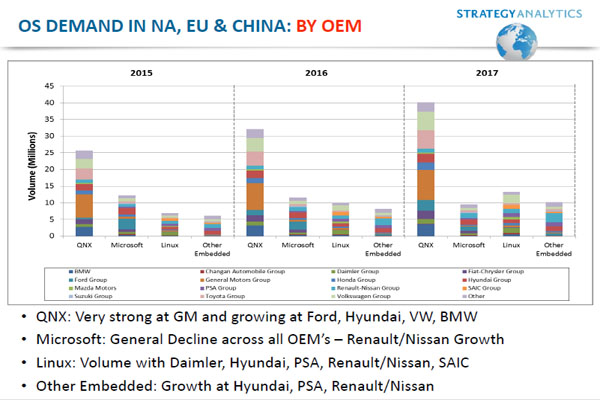 从我们的观察来看,2015-2017年,操作系统呈现增长趋势,QNX操作系统全球市场是主导,不同的颜色在全球市场分为不同区域,蓝色表示北美,红色是欧洲,绿色是中国。QNX在全球市场都有增长,其中微软在全球市场是在减弱的,最主要是因为福特公司从SYNC二代到三代,由微软替换成QNX。