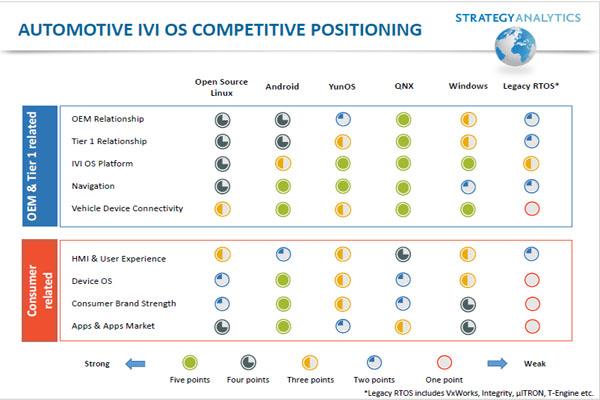 对于操作系统,我们把所有前端操作系统都列了出来。我们从两个层面分析,一个是通过这个操作系统,对于我们车厂以及对于一级供应商、硬件车机供应商,还有对消费者认识的价值,QNX在2B这一块,对供应商这一块比较强,是得分最多的。对于消费者来一块,黑莓手机基本用得很少,逐渐是弱化趋势。对YunOS来说,实际效果和实际生态方面,局限于个别的车厂,比如说上汽这样的车厂,其他的供应商关系也在成长中。