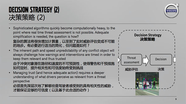 复杂的算法肯定会增加计算量,从以前的单目标到现在多目标多威胁的评估,以至到了实时威胁评估变成不可能的地步,有必要进行适当的简化。但问题是怎么简化?比如现在大家经常看到的中国式过马路,一群人一起走,走到路中间,可能有几个人继续往前走,有一些人停在那里,另一些人却往后退,这时候要判断预测是非常复杂的。所以,由于冲突对象潜在路径和速度的不可预测性,使得警告和干预措施如何定时、提升相关性和可信度始终受到挑战。我们必须首先深层次地了解哪些是驾驶员感受到的具有强相关性的威胁,才能提高决策的相关可信度。