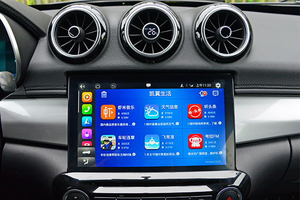 中控10.1英寸液晶屏上使用的是凯翼icar 1.0系统,总体上可以分为车联网、科技配置、语音控制、手机远程控制以及车内智能几大功能。除了包括空调在内的各种车辆设置之外,系统最大的特点就是整合了众多网络应用。车上乘客可以通过车载3G流量使用包括虾米音乐、考拉FM、飞常准等整合到系统内的常用手机APP,还有不少网络电台、音乐、资讯、小说等资源。车载WiFi热点、手机投影功能(并不支持苹果Carplay)等也是对乘客使用手机非常友好。