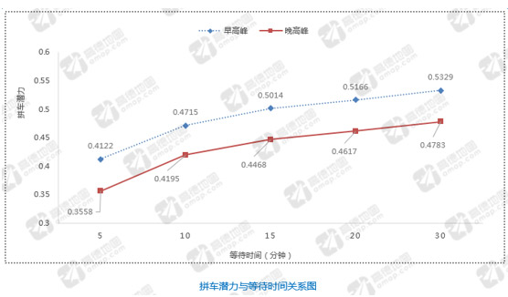 另一方面,等待时间是能否成功拼车的关键因素。当等待时间低于15分钟,拼车需求会随时间延长迅速增加;但当等待超过15分钟后,需求增长趋势减缓。这即是说,15分钟是用户拼车等待时间的临界值。