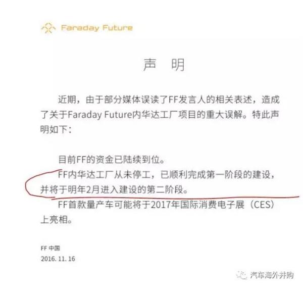 但法拉第未来11月15日发表官方声明,称“目前FF的资金已经陆续到位。FF内华达工厂并未停工,已经顺利完成第一阶段的建设,并将于明年2月进入建设的第二阶段。FF首款量产车可能将于2017年国际电子消费展(CES)上亮相。”
