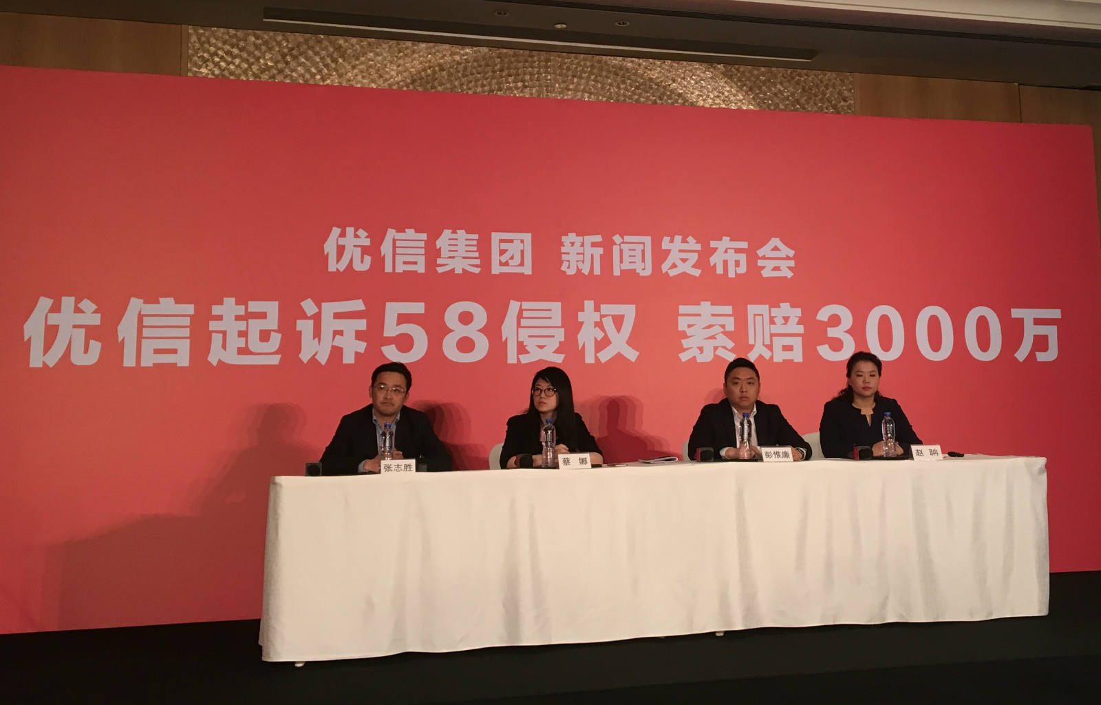 针对58同城在其网站仿冒“优信二手车”一事,优信二手车召开新闻发布会,表示该事件严重损害了优信二手车的商业声誉,已经构成了事实上的不正当竞争。优信二手车执行总裁彭惟廉表示,优信二手车已经向北京市朝阳区人民法院提起诉讼,索赔三千万元人民币,法院已经予以立案。对此,58集团公关回应:不配合对方炒作。